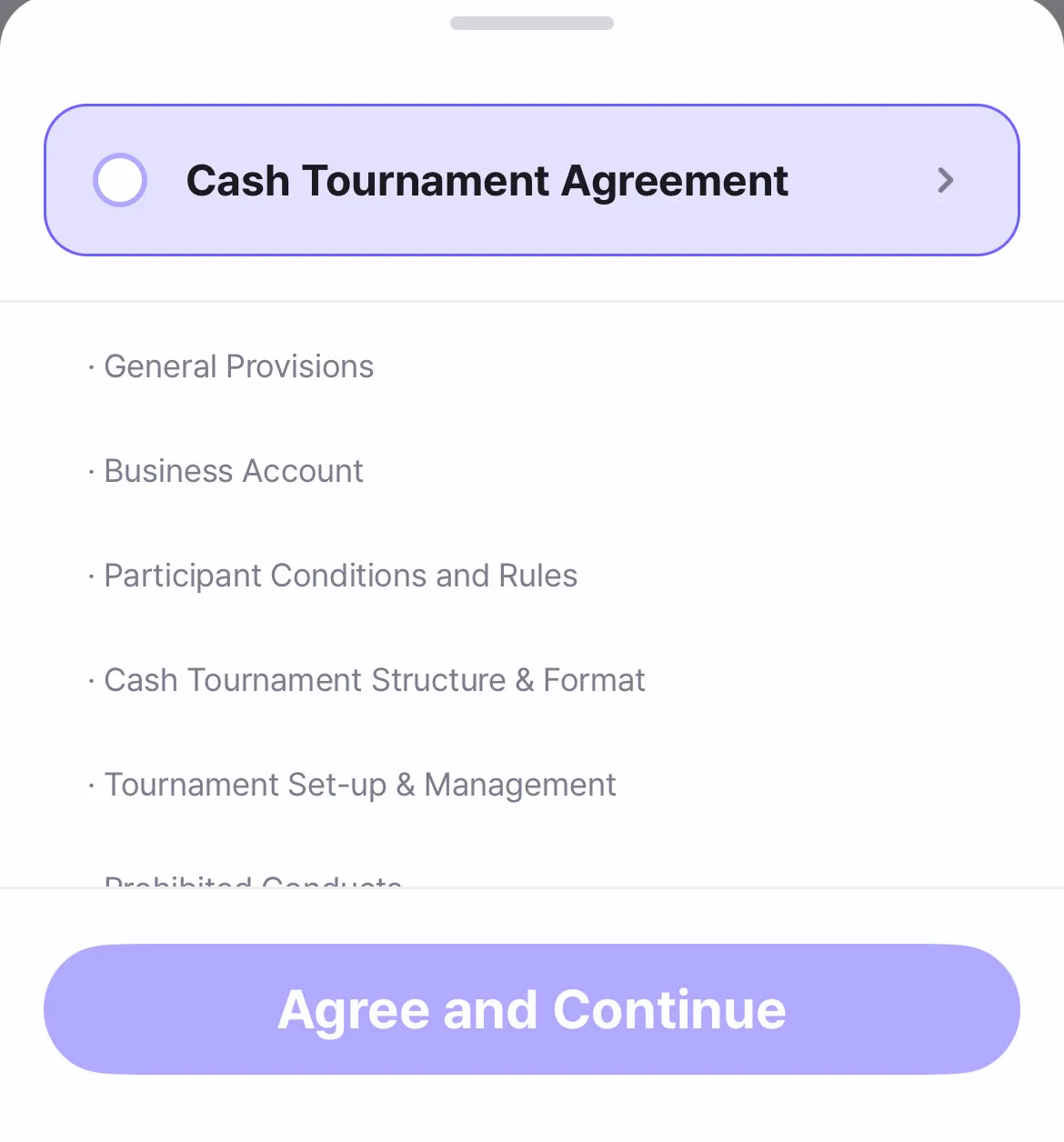 Review the Cash Tournament Agreement, and tap Agree and Continue if you consent.