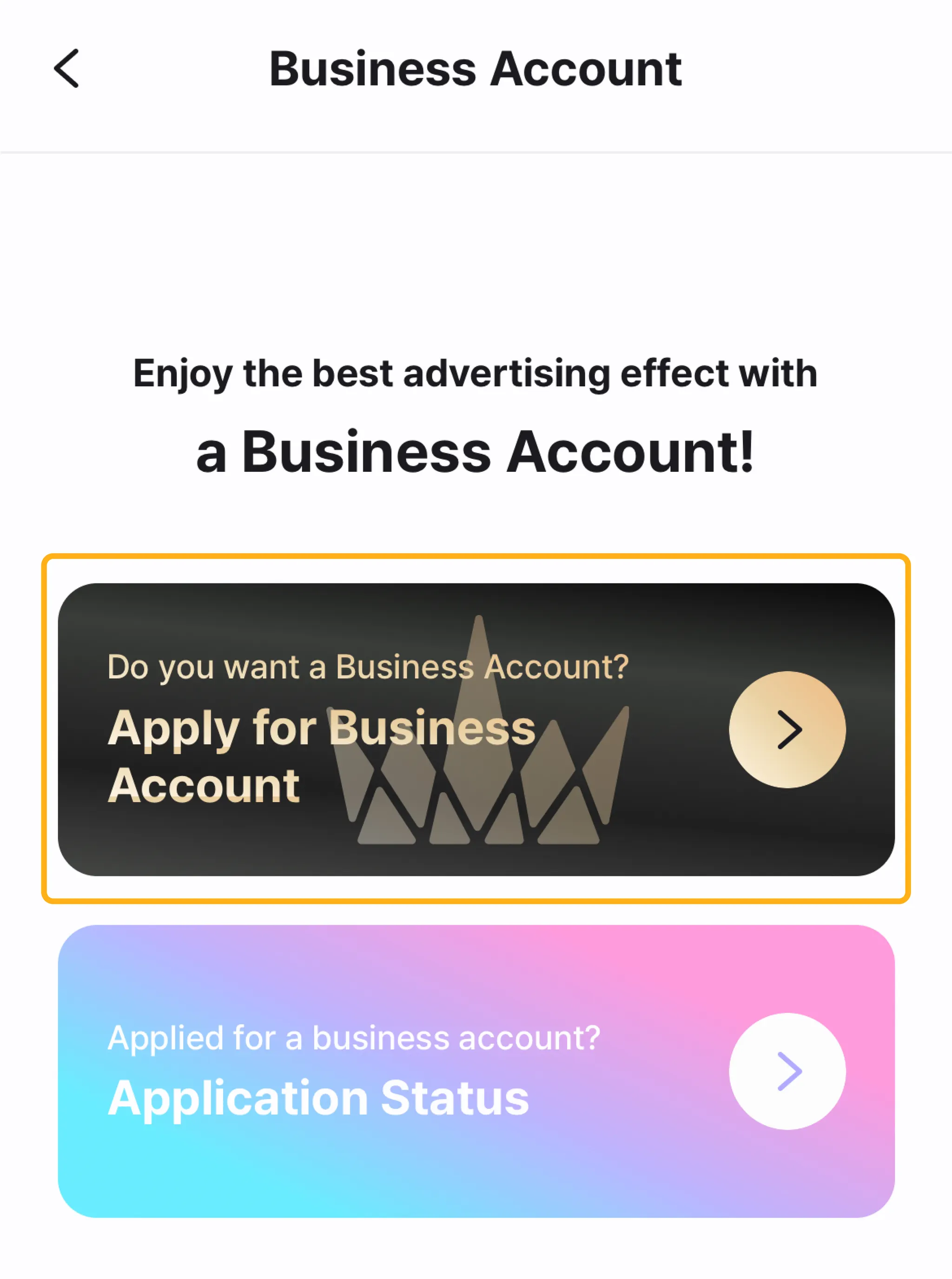 On the menu bar, tap your profile pic and hold for 3 secs. ⇒ Tap Create Business Account in the popup.